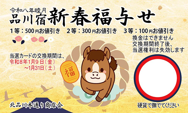 北品川本通り商店会 新春福与せ売出しお得なスクラッチカードをお1人様1枚づつ配布しております 当選種類 1等 参加店舗にて500円引き 2等 参加店舗にて300円引き 3等 参加店舗にて100円引き 北品川本通り商店会Hp 売出し詳細 FacebookXBlueskyCopy